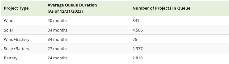 Interconnection wait times are also growing. The typical duration from connection request to commercial operation has increased from <2 years for projects built in 2000-2007 to 4+ years for those built in 2018-2023, with a median of 5 years for projects built in 2023.